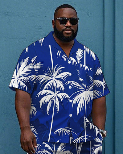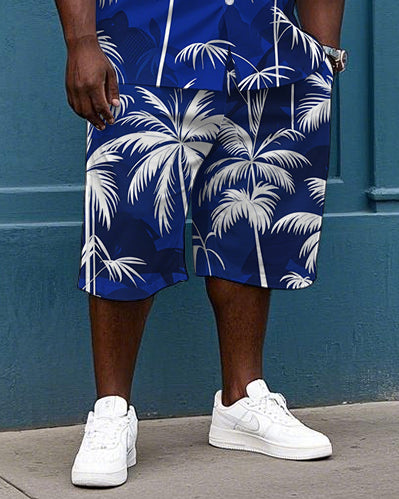 Big and Tall Guys' Hawaiian Coconut Trees Printed Cuban Collar Short Sleeve Shirt Shorts Set