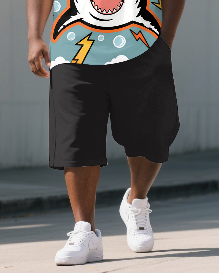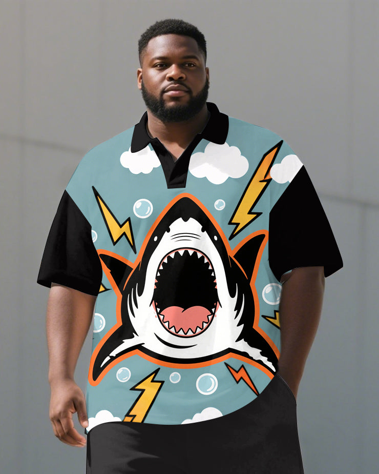 Big and Tall Men's Casual Cute Shark Cartoon Printed Outdoor Short-Sleeve Polo Shirt & Shorts Set