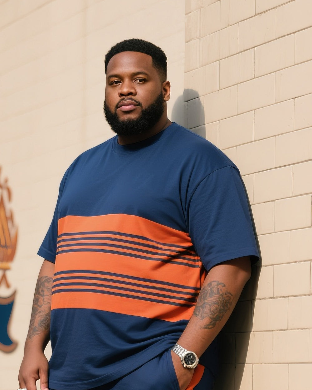 Big Boy Daily Casual Prussian Blue Spelling Hermes Orange Striped Crewneck Short Sleeve T-shirt Flame Trousers Suit