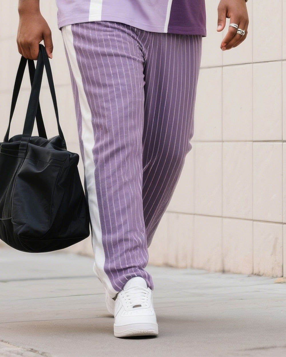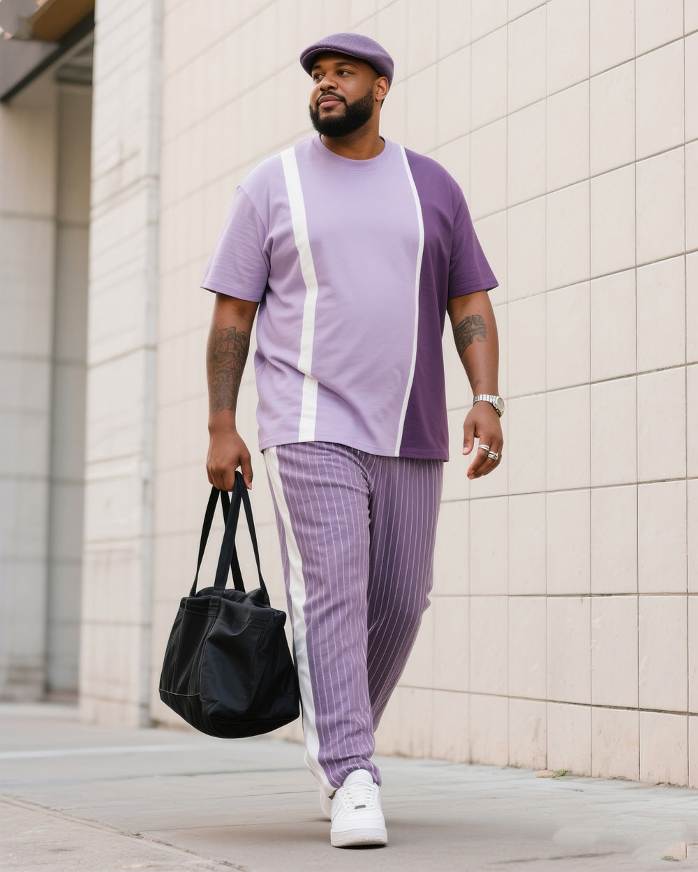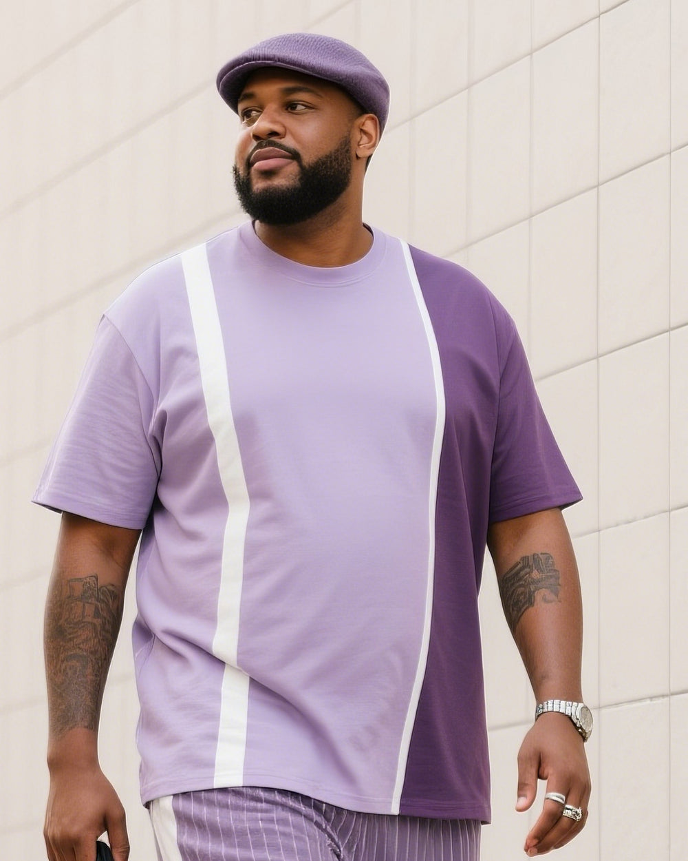 Big Boy Street Fashion High Purple Easy Color-block Striped Short-sleeve Trousers Suit
