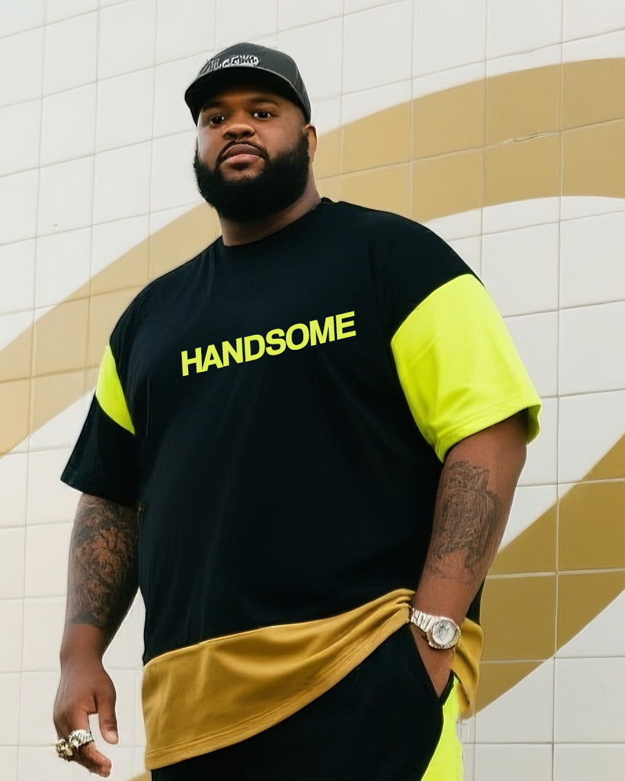 Big Boy's Daily Casual Laminated Black Spelling Fluorescent Green Plus Gold Laminated Round Neck Short Sleeve T-Shirt Striped Trousers
