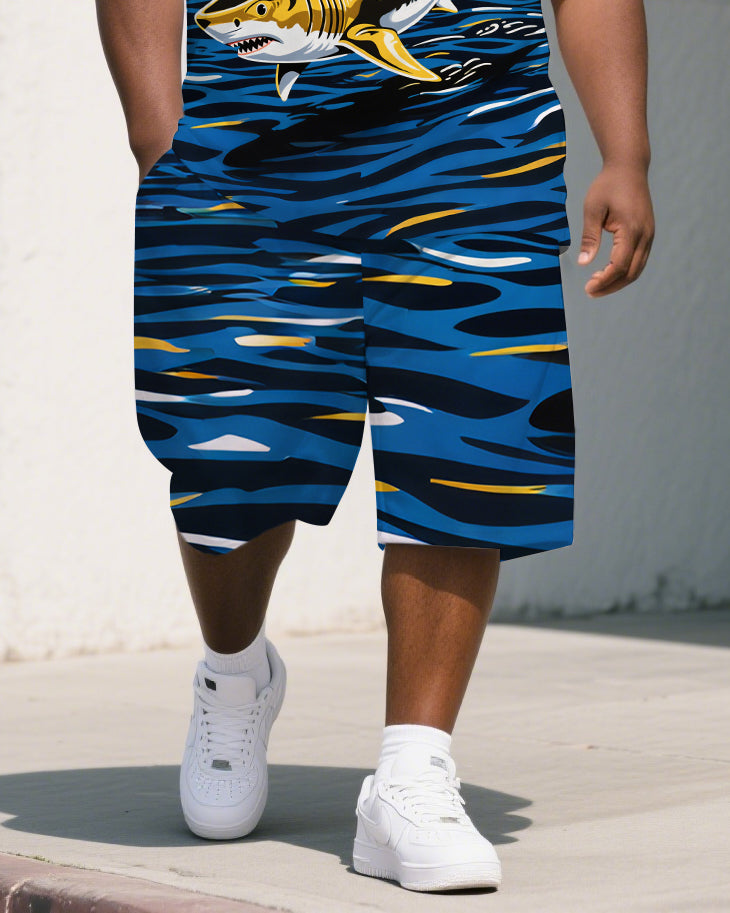 Big Guy's Artistic Shark Turbine Cartoon Printed Casual Short-Sleeve Polo Shirt & Shorts Set