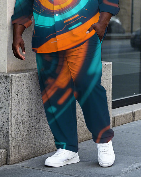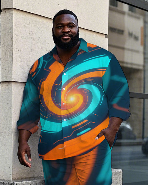 Big Guy's Casual Abstract Machine Vortex Printed Street Fashion Long Sleeve Shirt Pants Set