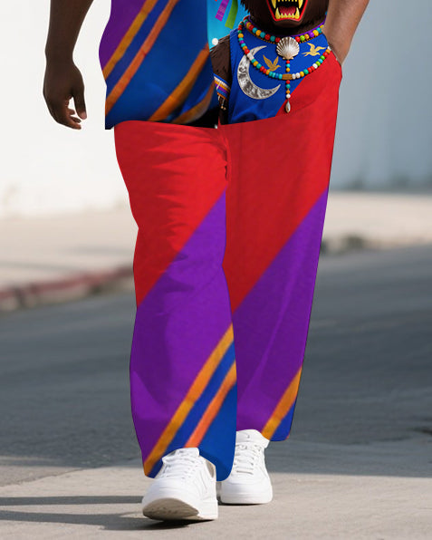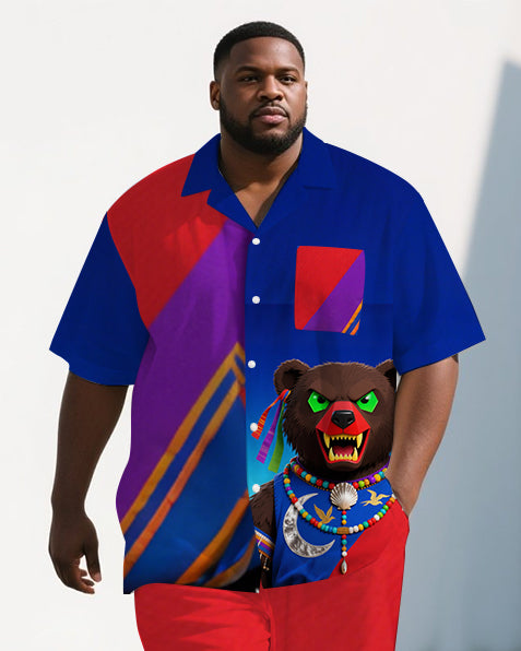 Big Guy's Color Block Cartoon Bear Theme Casual Short Sleeve Shirt Pants 2-Piece Set
