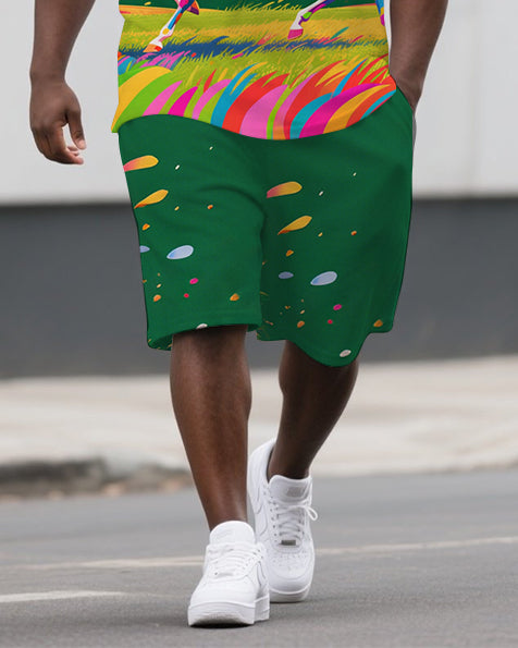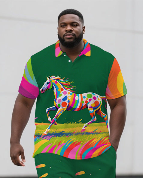Big Guy's Dreamy Animal Running Horse Printed Casual Short-Sleeve Polo Shirt & Shorts Set