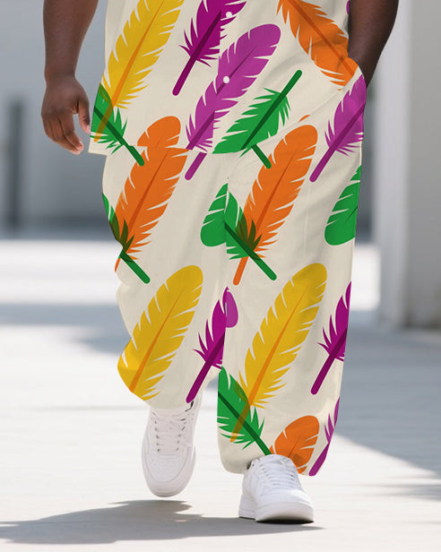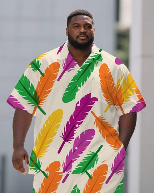 Big Guy's Fashion Colorful Feather Cartoon Printed Casual Short-Sleeve Shirt Pants Sets