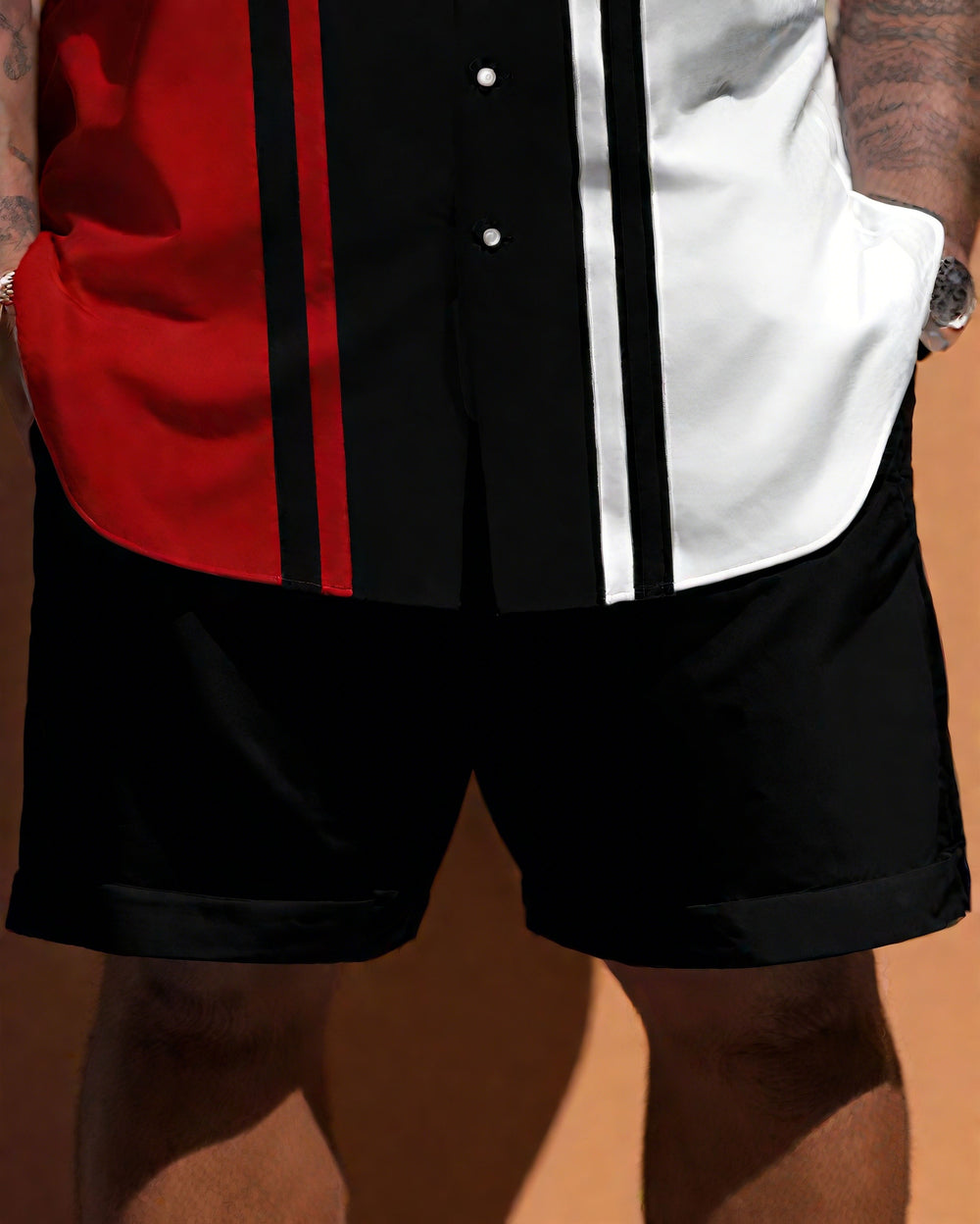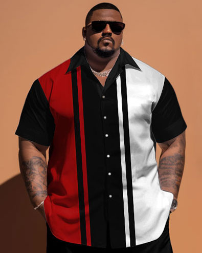 This short-sleeve shirt and shorts set for big guys features a modern fashion. The color block design is arranged horizontally, simple yet fashionable. Its loose cut and large size selection are better for big guys. This simple and modern set ensures you shine on various occasions.