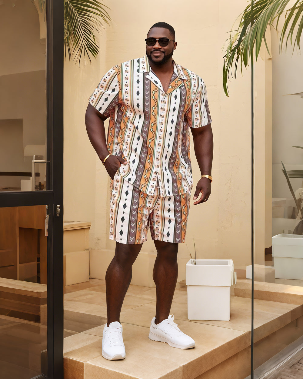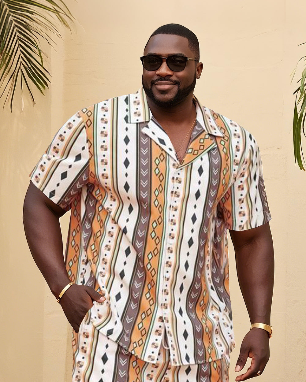 Big Man's Confident Daily Casual/Holiday Vacation Diamond Color Block Printed Short Sleeve Shirt Shorts Suit