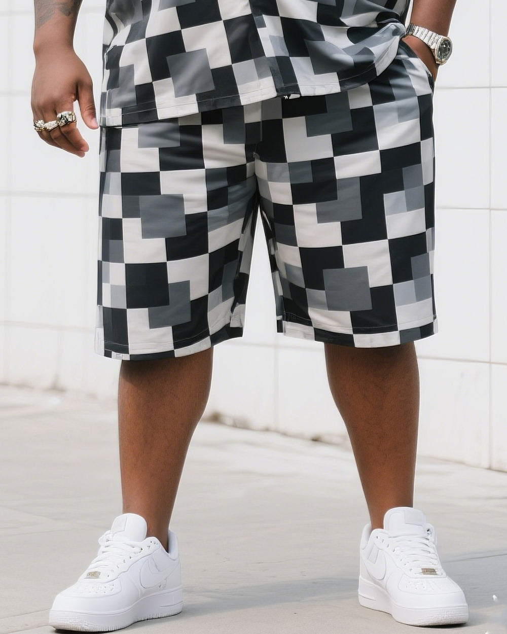 Big Man's Daily Leisure Outdoor Activities Black And White Gray Creative Checkered Camouflage Short Sleeve Shirt Shorts Suit