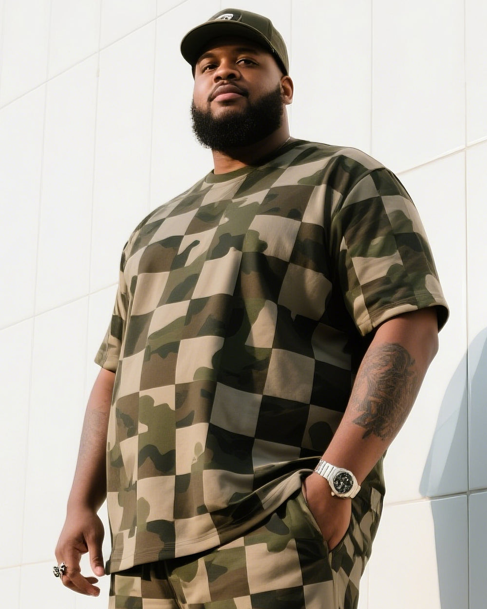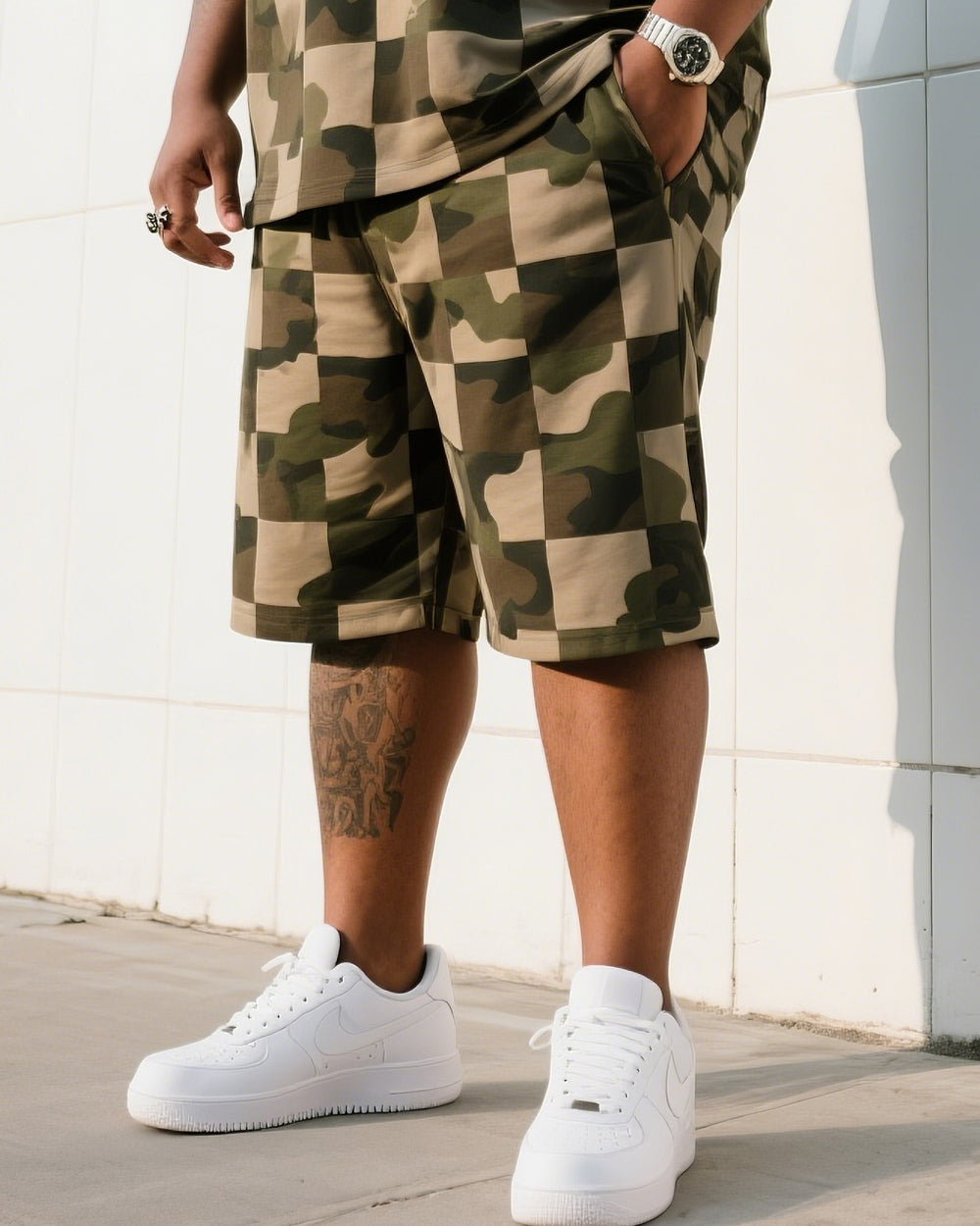 Big Man's Daily Leisure Outdoor Activities Creative Checkered Camouflage Short Sleeve Shirt Shorts Suit
