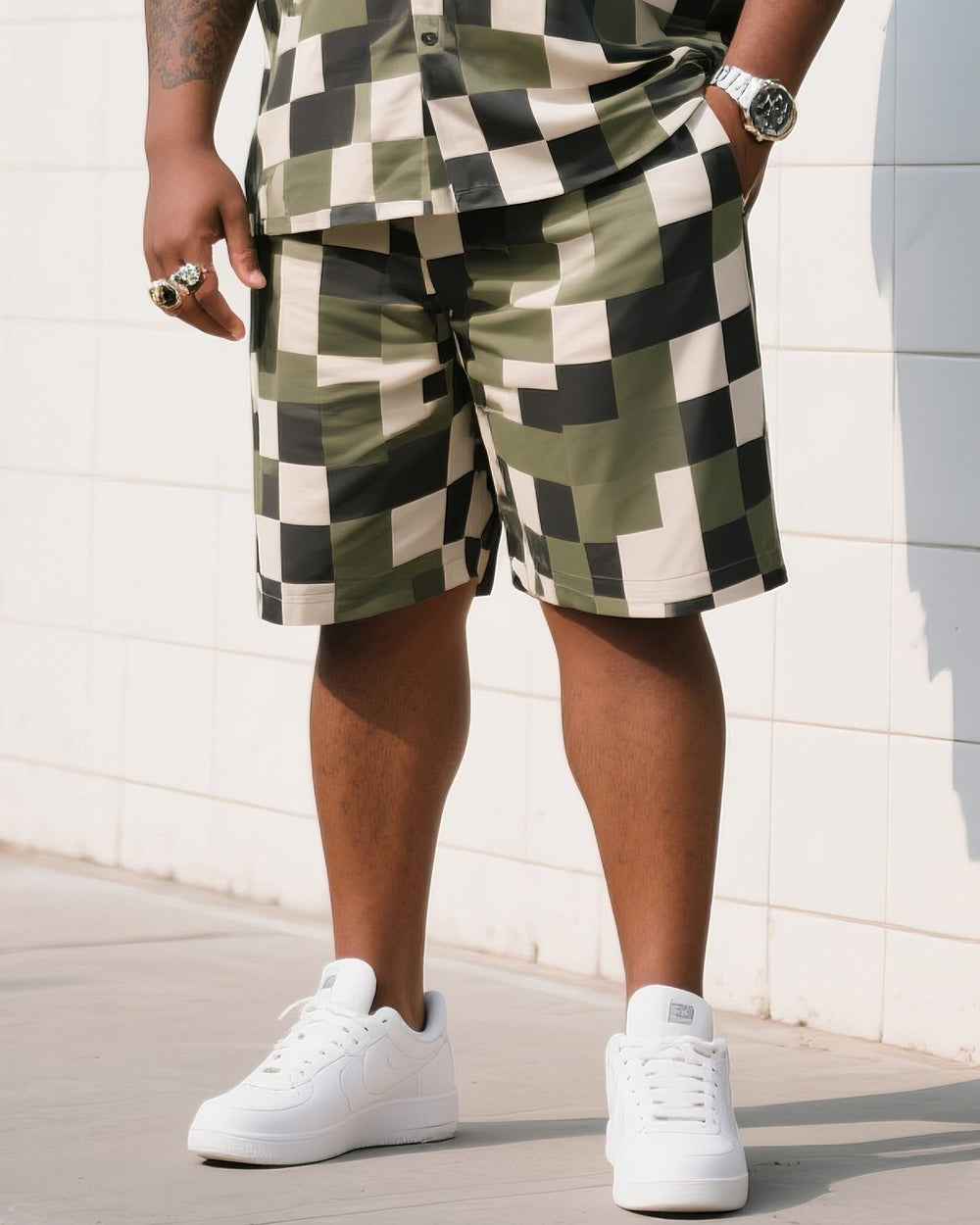 Big Man's Daily Leisure Outdoor Activities High Sense Creative Checkered Camouflage Short Sleeve Shirt Shorts Suit