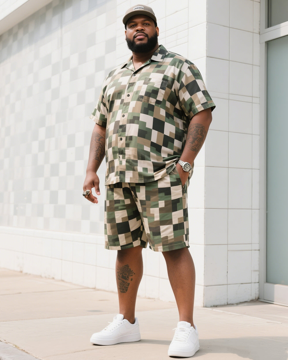 Big Man's Daily Leisure Outdoor Activities High Sense Creative Checkered Camouflage Short Sleeve Shirt Shorts Suit