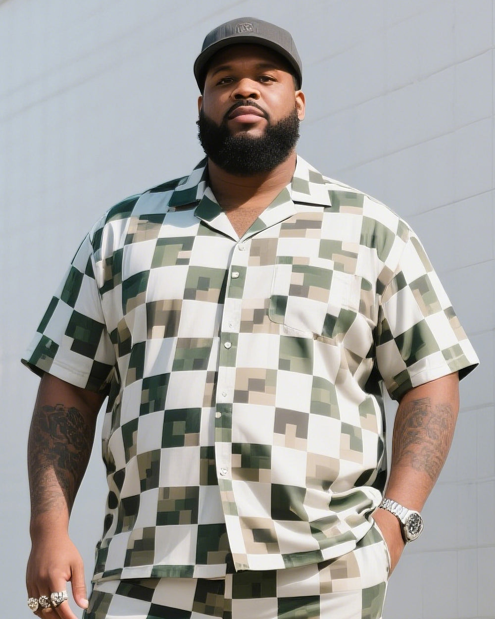Big Man's Daily Leisure Outdoor Activities Square Puzzle Creative Camouflage Short Sleeve Shirt Shorts Suit