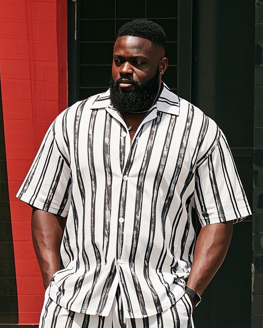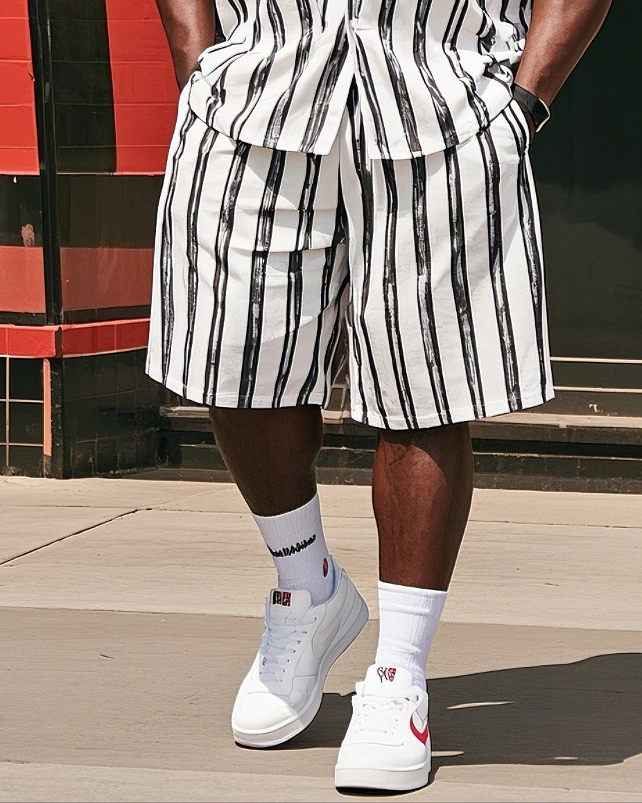 Big Man's Simple Stripe Stitching Color Block Printing Short Sleeve Shirt Shorts Suit