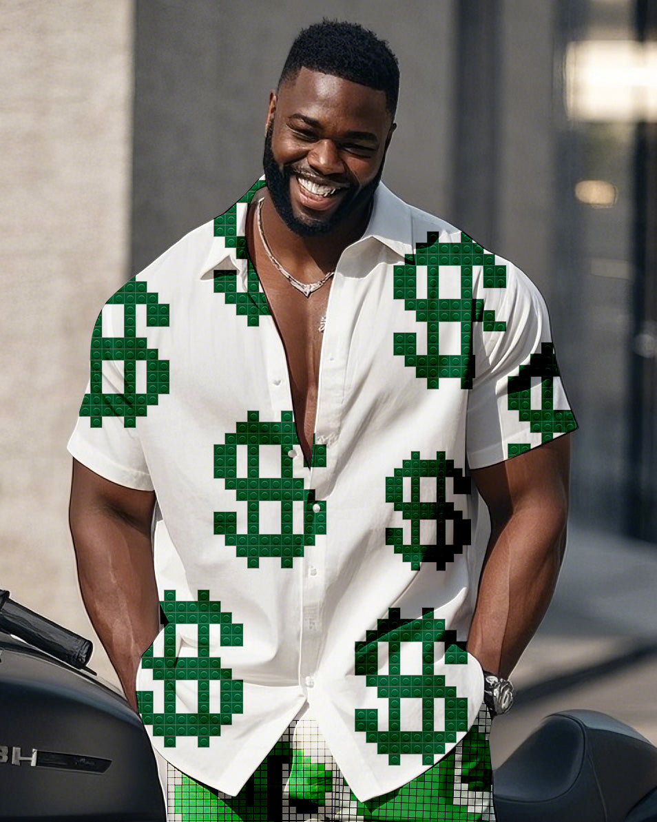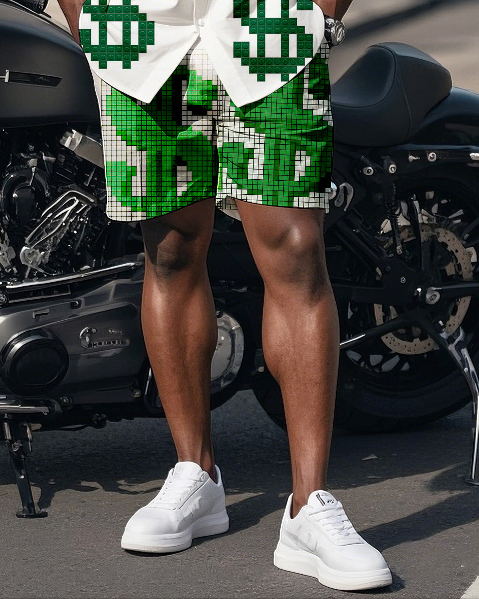 Big Man's Street Biker Style Green My World Creative Dollar Print White Short Sleeve Shirt Shorts Suit