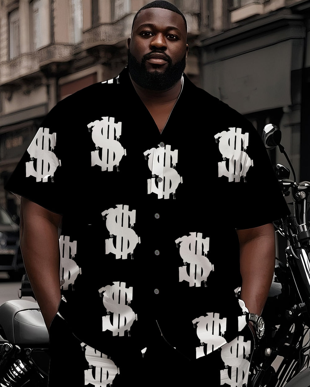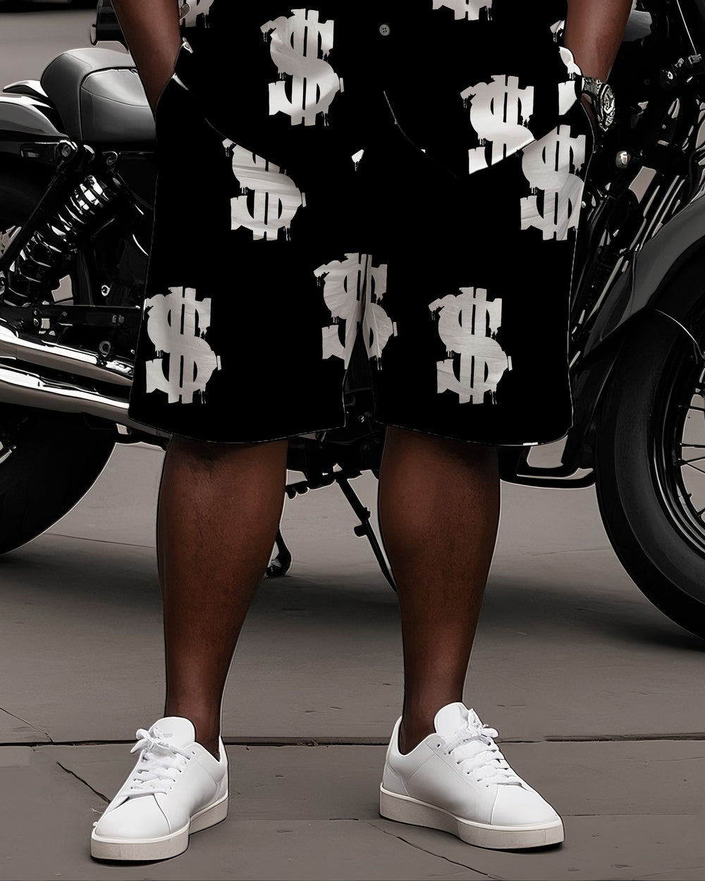 Big Man's Street Biker Style White Dollar Print Black Short Sleeve Shirt Shorts Suit