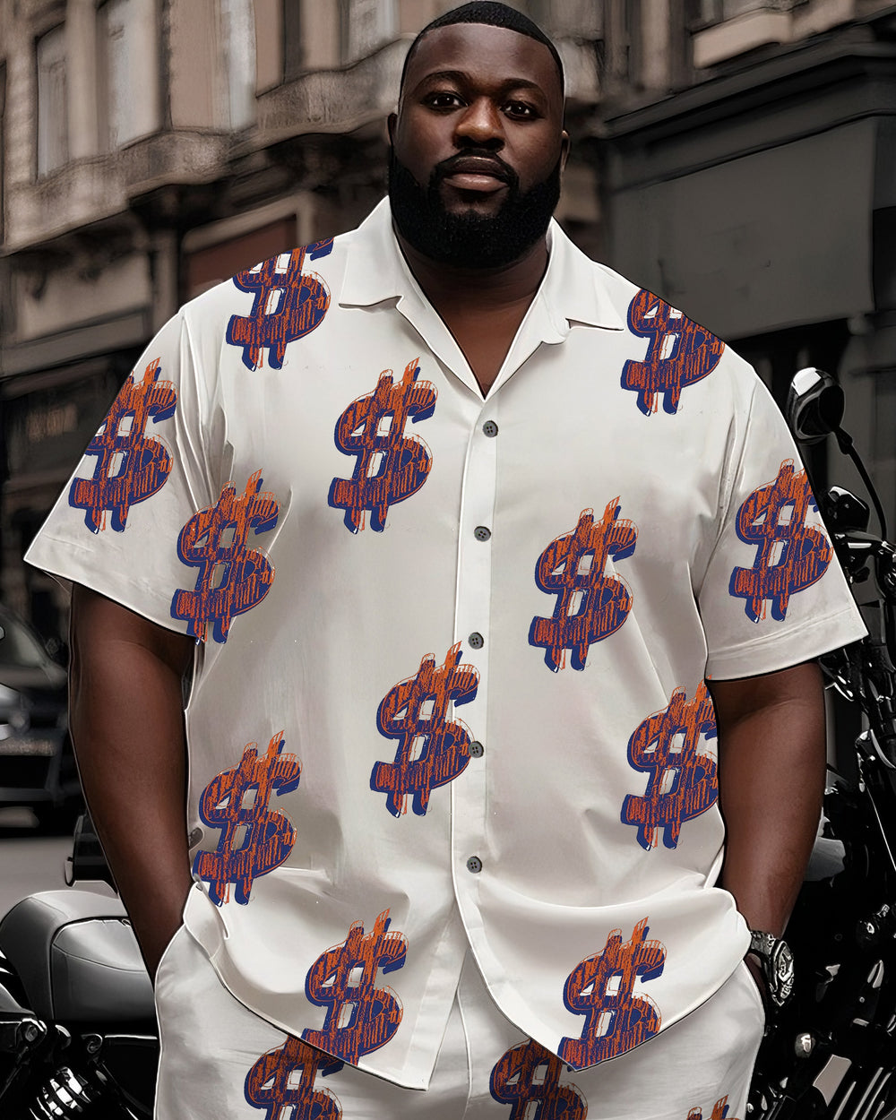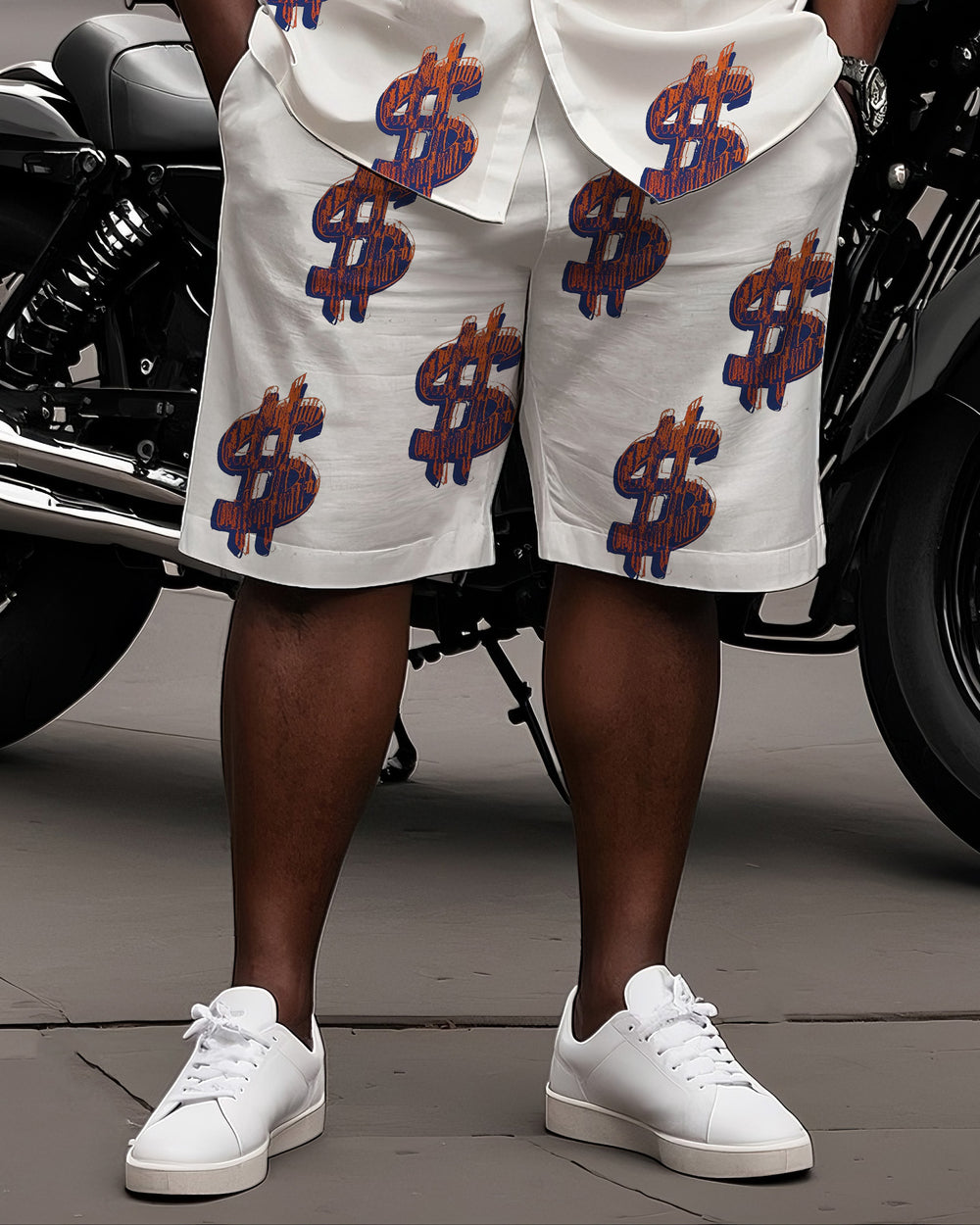 Big Man's Street Motorcycle Style Purple Creative Dollar Print White Short Sleeve Shirt Shorts Suit