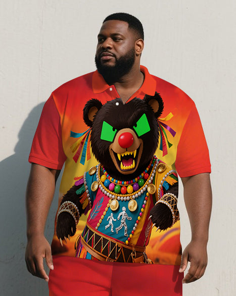 Big Man's Summer Ethical Fun Bear Cartoon Gradient Short-Sleeve Polo Shirt & Shorts Set