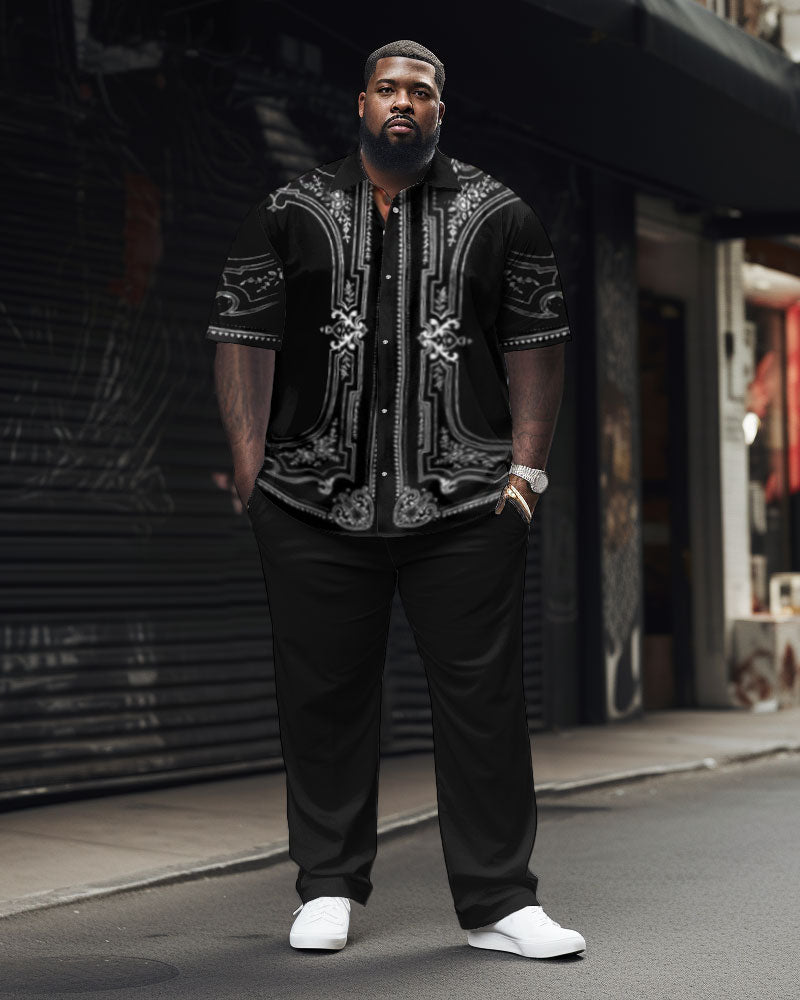 This short-sleeve shirt and pants set for big men can make you feel fashion and elegance. Printed with retro white patterns, it breaks the monotony and adds visual focus. It is for retro fashion lovers and can be easily matched on various occasions.