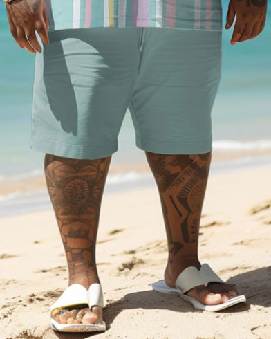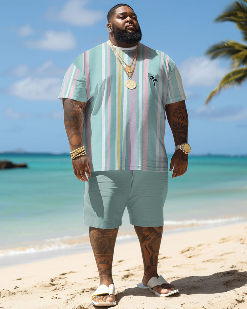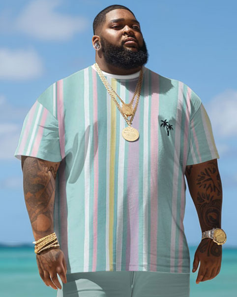 If you want to try a different , you can't miss this T-shirt and shorts set for big men. The small coconut tree print and stripes add a touch of tropical style and modern fashion to the whole outfit. Comfortable to wear, you can enjoy your summer without any hassle.
