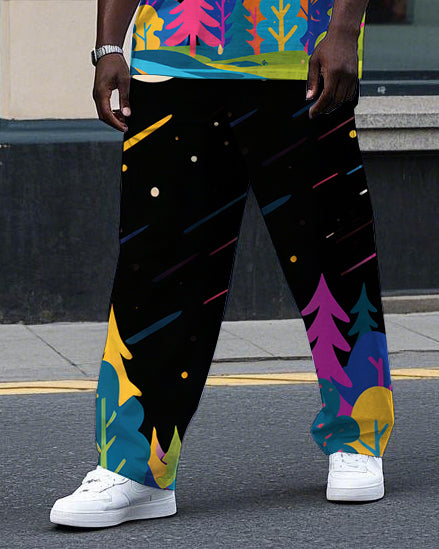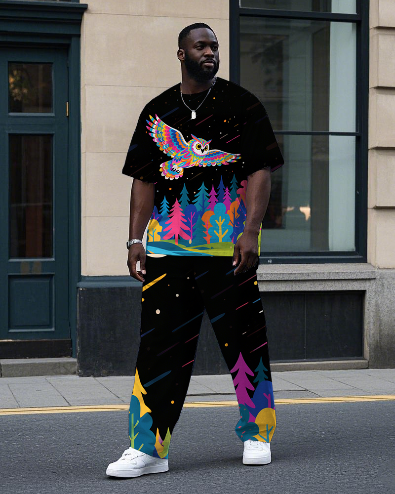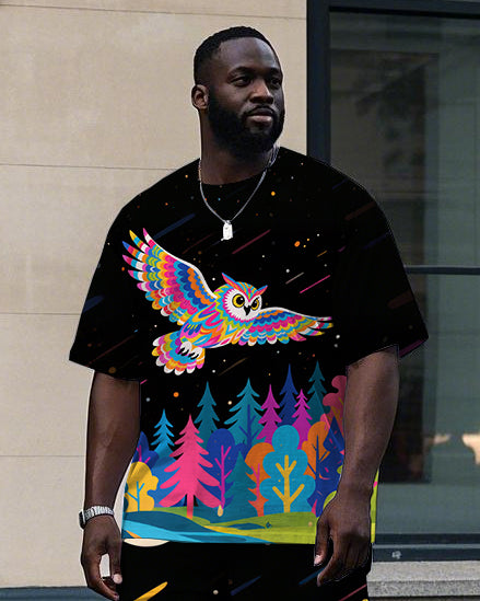 Big Men's Animal Theme Flying Owl Cartoon Printed Summer Short Sleeve T-shirt Pants Set