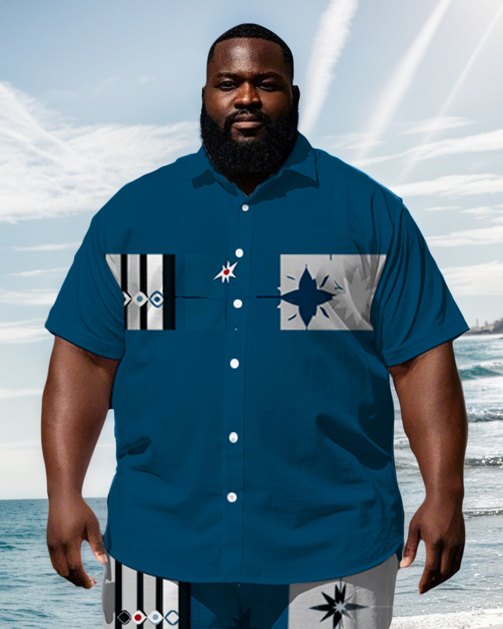 Big Men's Artistic Fashion Color Block Stripe & Starts Printed Casual Short Sleeve Shirt Shorts Set