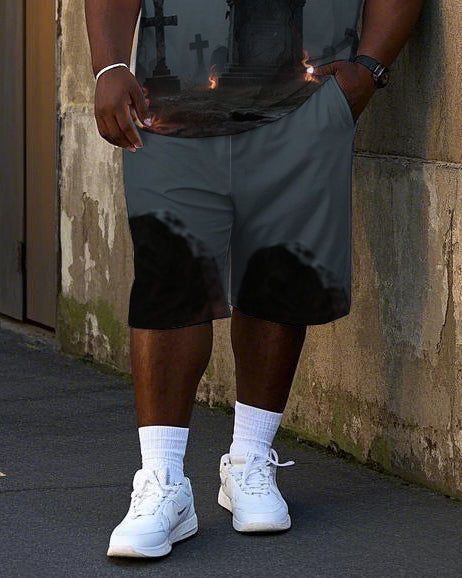 Big Men's Bear In Cemetery Gothic Printed Short Sleeve T-Shirt Shorts 2-piece Set