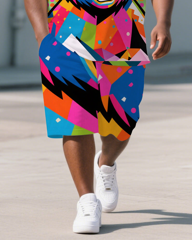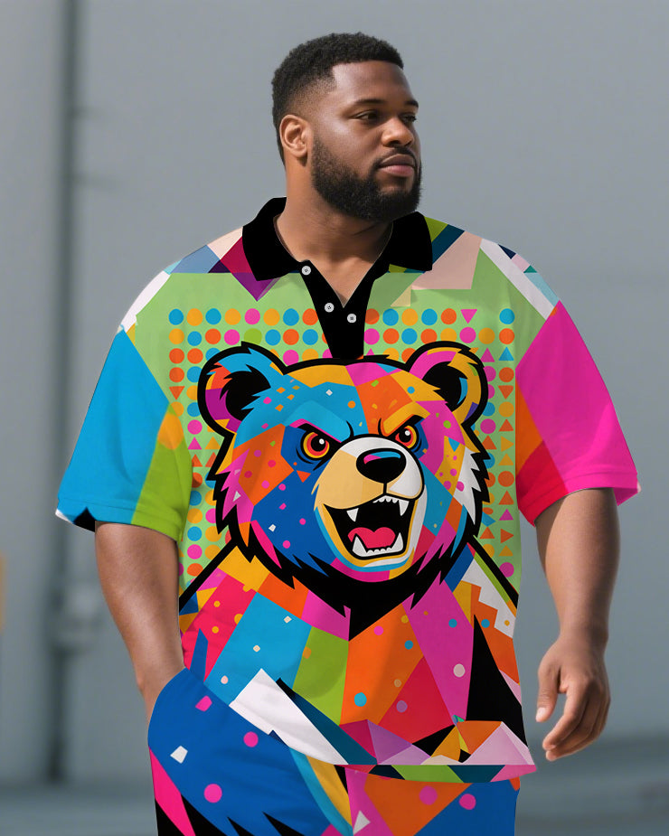 Big Men's Casual Abstract Splicing Bear Cartoon Printed Short-Sleeve Polo Shirt & Shorts Set