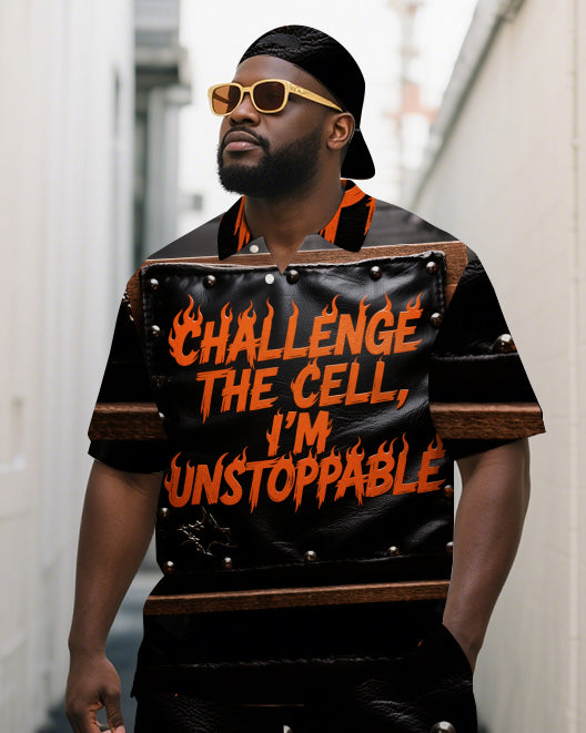Big Men's Casual CHALLENGE THE CELL Lettering Relaxed Short-Sleeve Polo Shirt Shorts Set