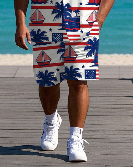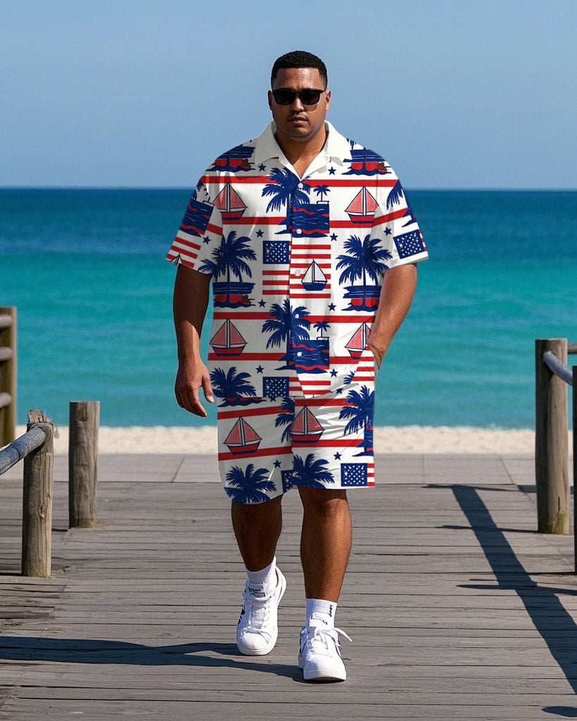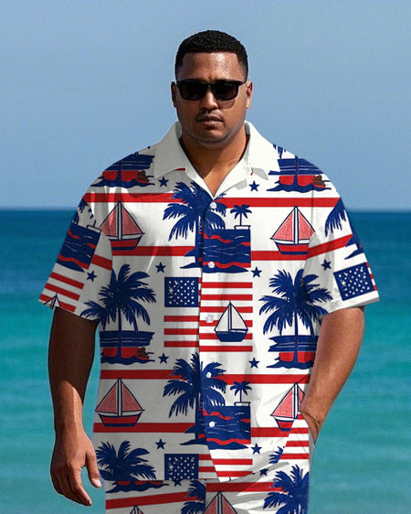 Big Men's Casual Flag Inspired Hawaii Coconut Trees & Sailboat Printed Short Sleeve Shirt Shorts Set