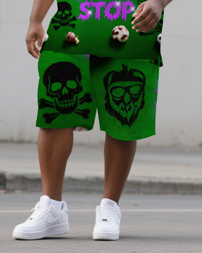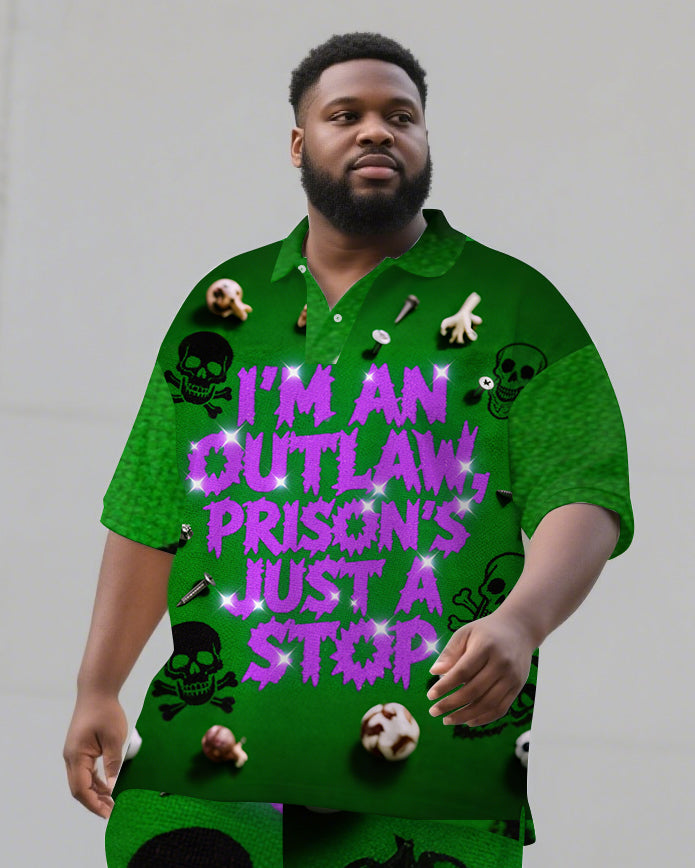 Big Men's Casual PRISON Style Bling Letter and Skull Printed Short-Sleeve Polo Shirt Shorts Set