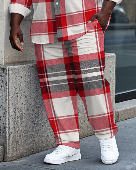 Big Men's Classic Black & Red Plaid Printed Casual Business Long Sleeve Shirt Pants Set