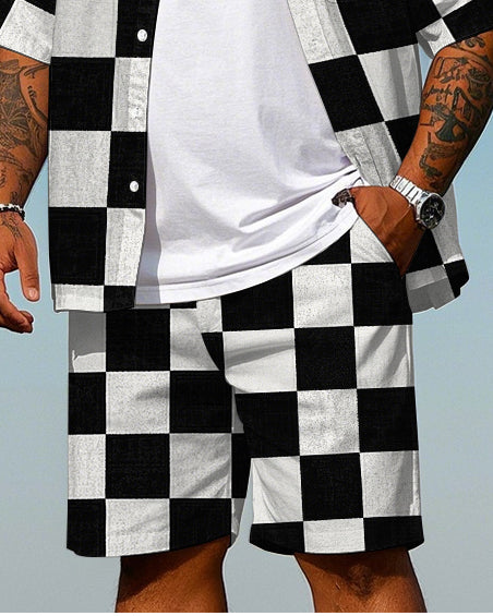 Big Men's Classic Black & White Plaid Printed Daily Casual Short Sleeve Shirt and Shorts Set