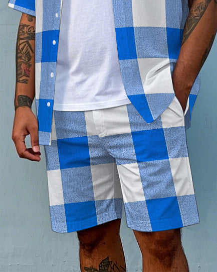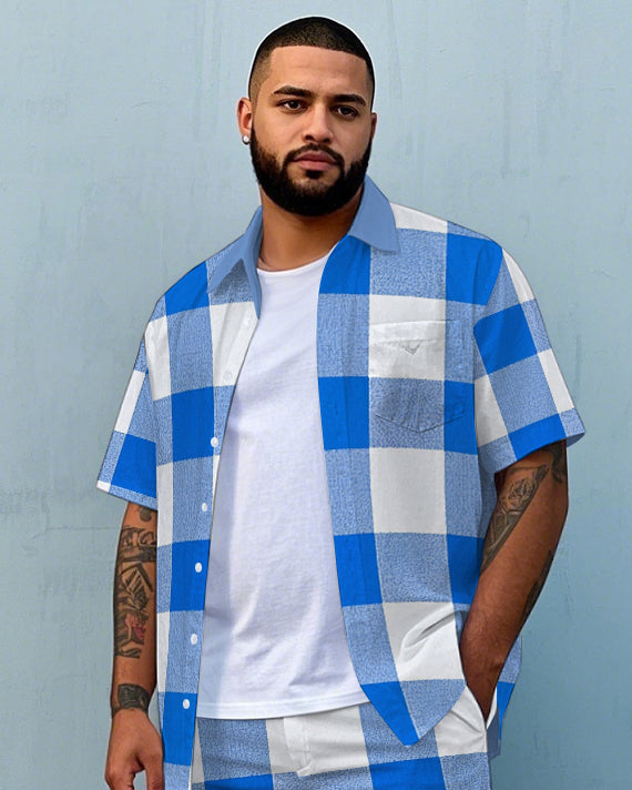 Big Men's Classic Blue & White Plaid Printed Pocket Short Sleeve Shirt and Shorts Set