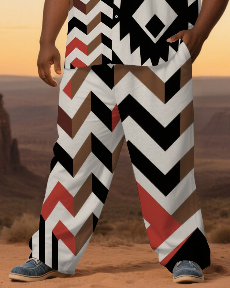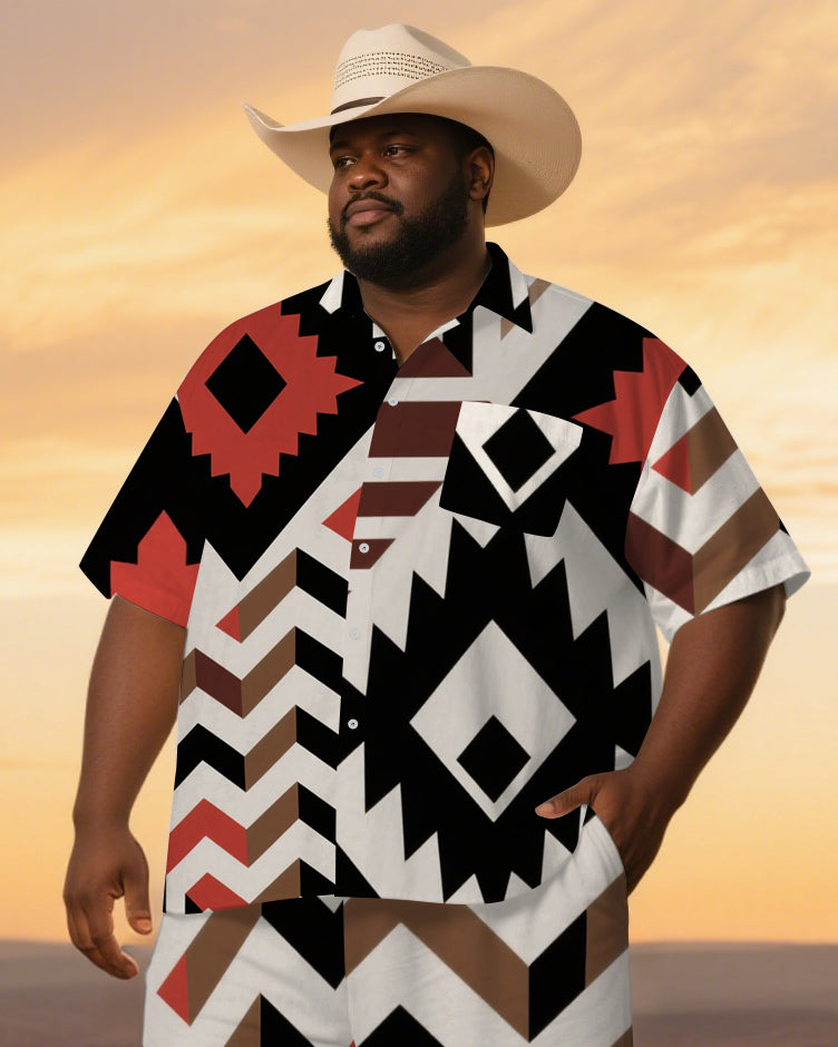 Big Men's Classic Geometric Pattern Western Style Casul Short-Sleeve Shirt Pants Sets
