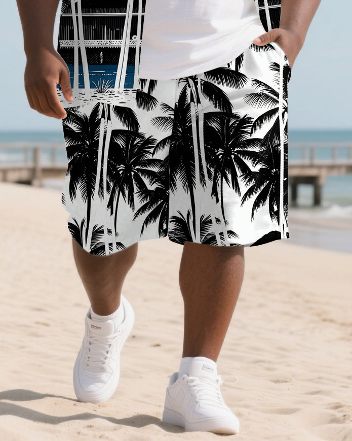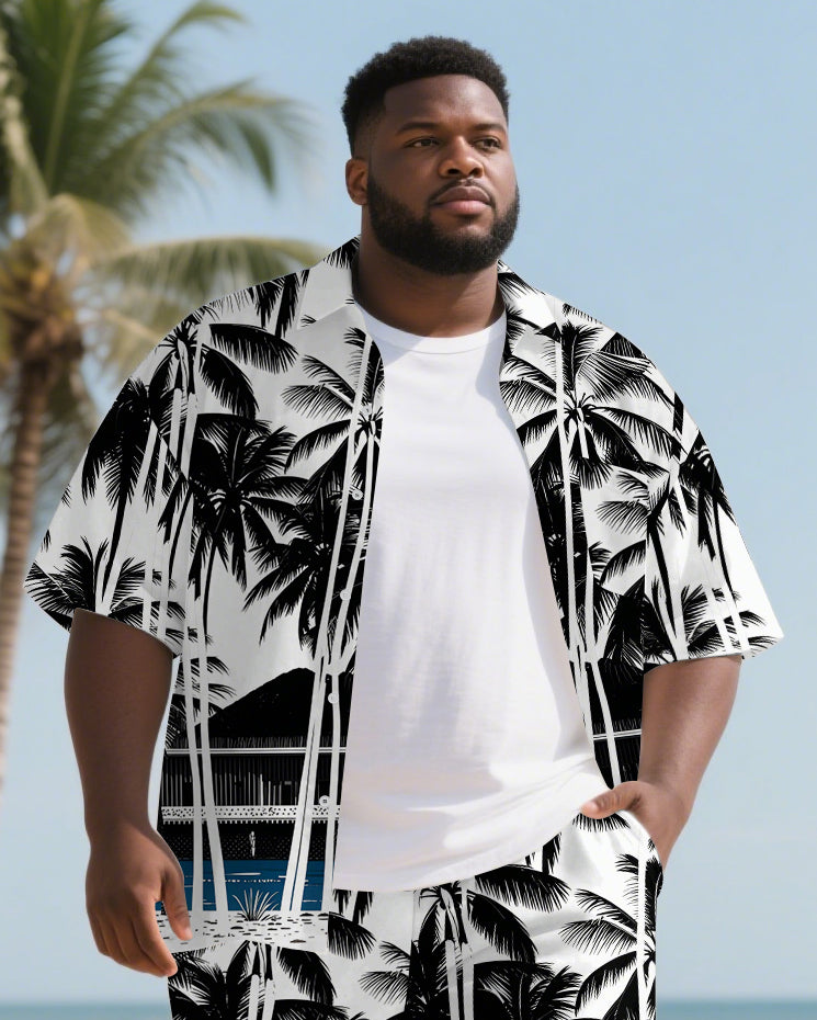 Big Men's Classic Hawaiian Coconut Trees Painting Style 2-Piece Short Sleeve Shirt Shorts Suit
