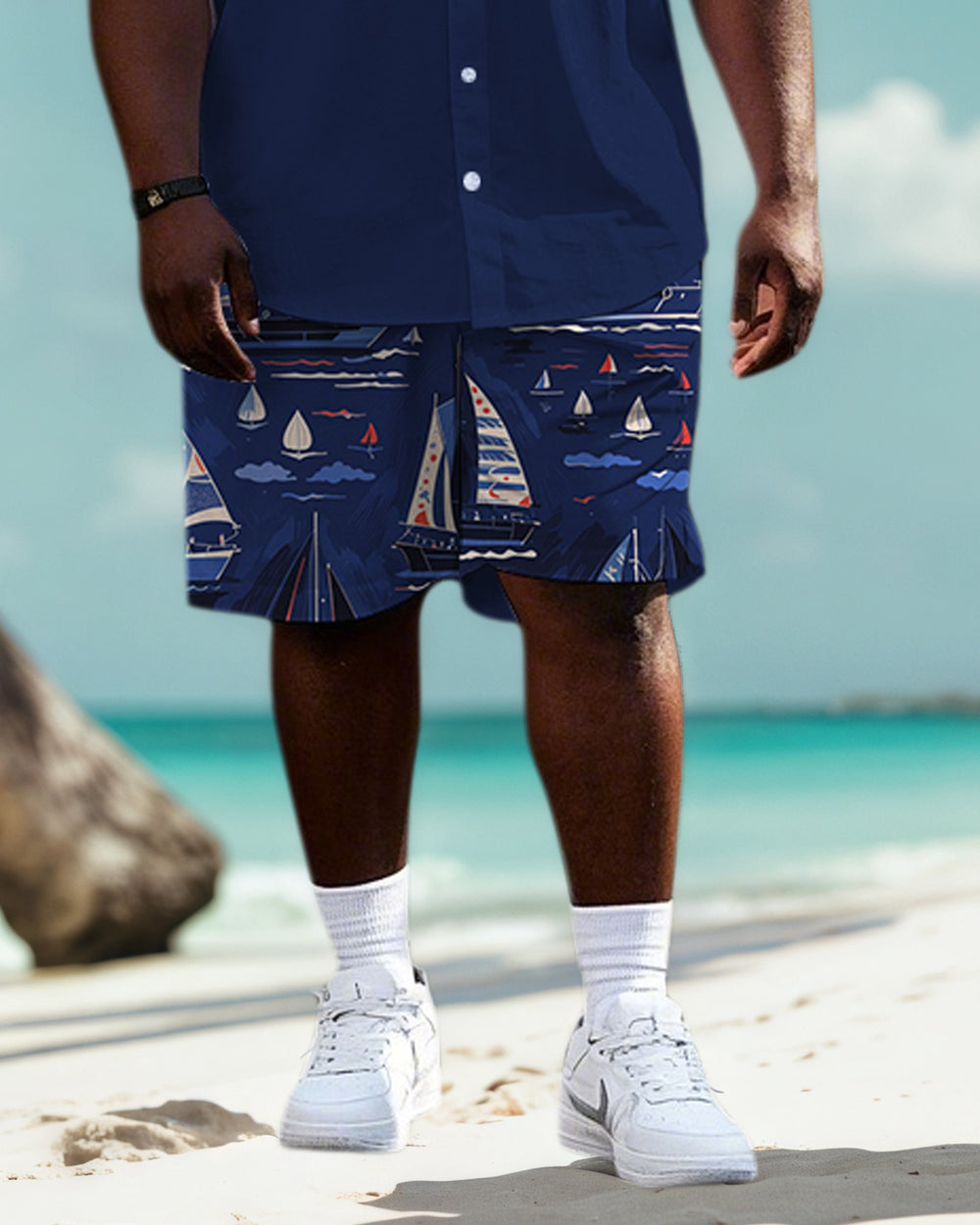 Big Men's Color Block Funny Sailboat Pattern Printed Short Sleeve Shirt Shorts Set