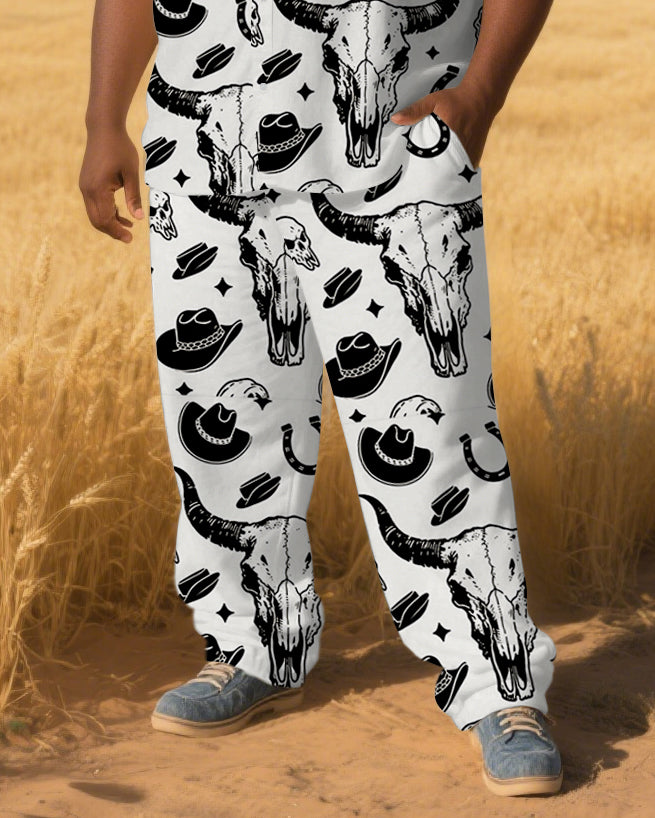 Big Men's Cowboy Style Cartoon Cow & Hat Printed Outdoor Short-Sleeve Shirt Pants 2-piece Sets