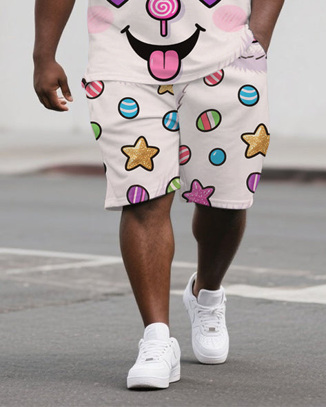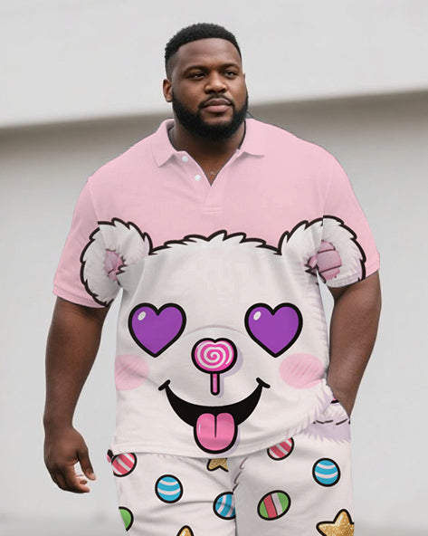 Big Men's Cute Sugar Bear Printed Casual Outdoor Short-Sleeve Polo Shirt Shorts Set