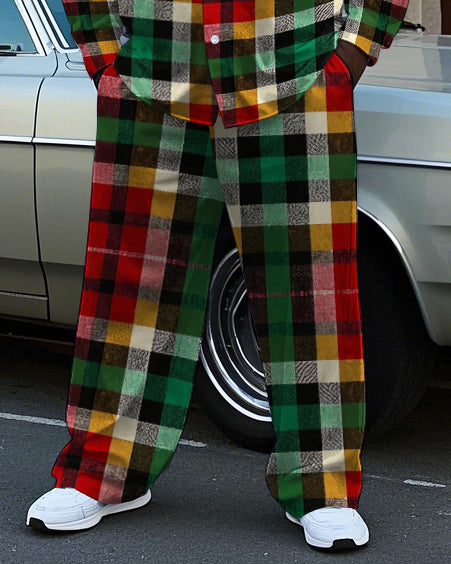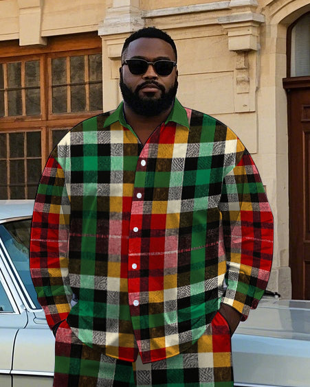 Big Men's Daily Casual Colorful Plaid All Over Printed Long Sleeve Shirt Pants Set