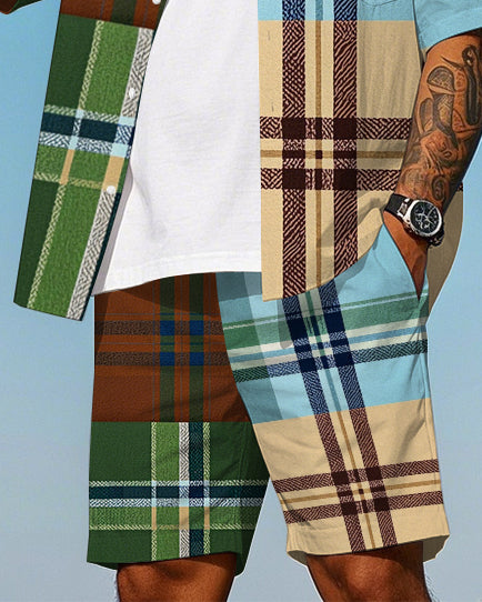 Big Men's Daily Casual Splicing Color Plaid Printed Short Sleeve Shirt and Shorts Set