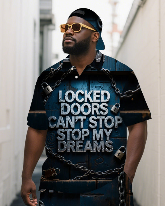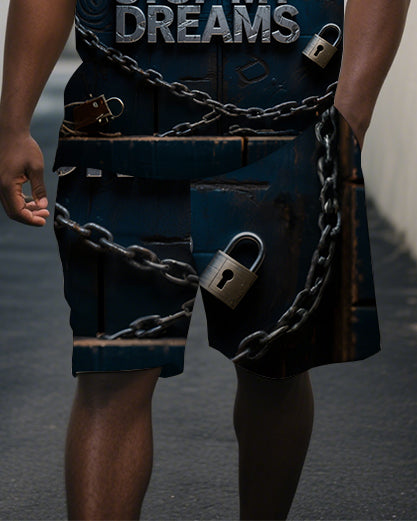 Big Men's Dark Style Lock and Chain Letter Printed Casual Short-Sleeve Polo Shirt Shorts Set