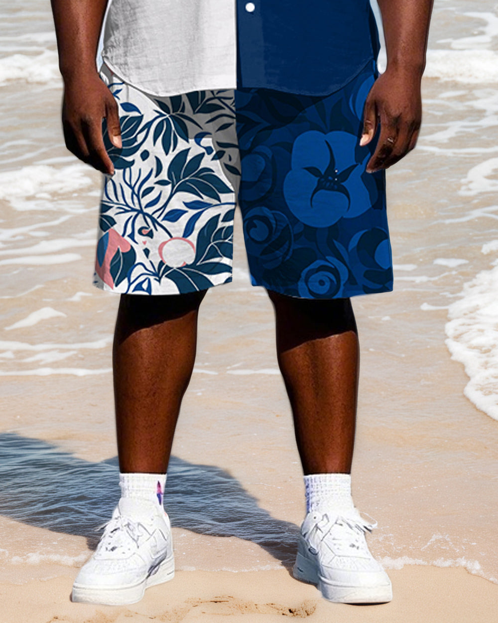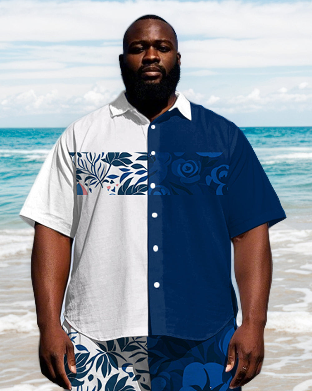 Big Men's Fashion Color Block Splicing Abstract Leaves & Floral Printed Short Sleeve Shirt Shorts Set