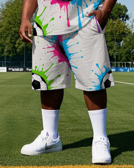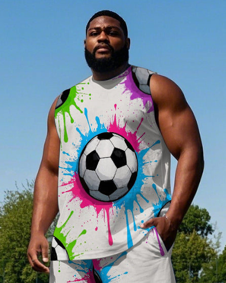 Big Men's Fashion Colorful Ink Splash Football Printed Round Neck Casual Vest and Shorts Set