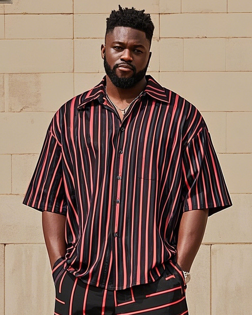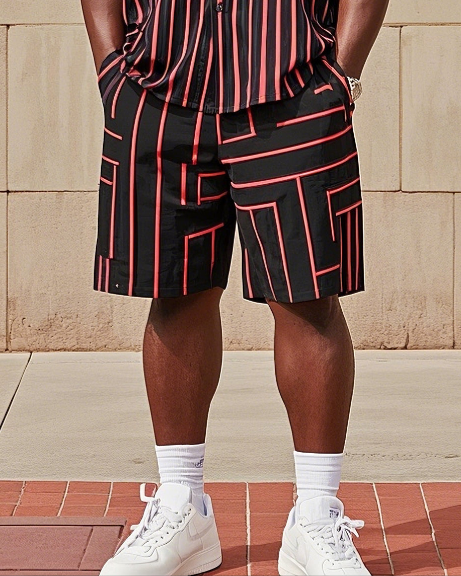 Big Men's Fashion Red Black Striped Color Block Printing Short Sleeve Shirt Shorts Suit