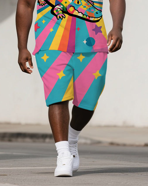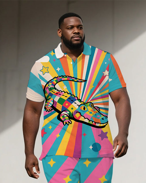 Big Men's Funny Splicing Colorful Crocodile Cartoon Printed Short-Sleeve Polo Shirt & Shorts Set