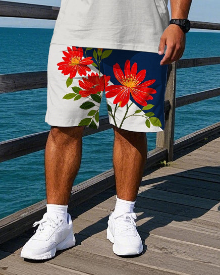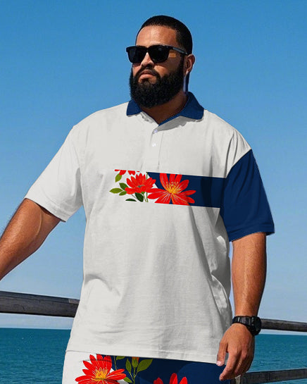 Big Men's Gentlemen Romantic Floral Stripe Printed Casual Short Sleeve Polo Shirt Shorts Set