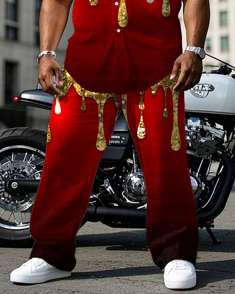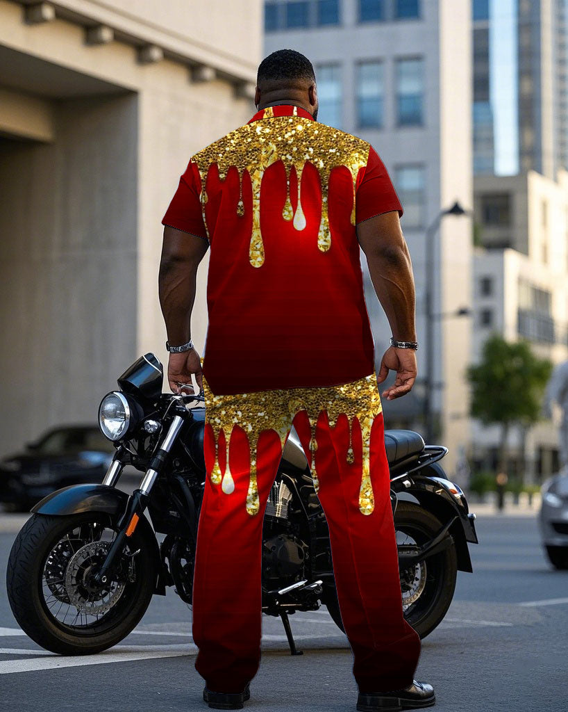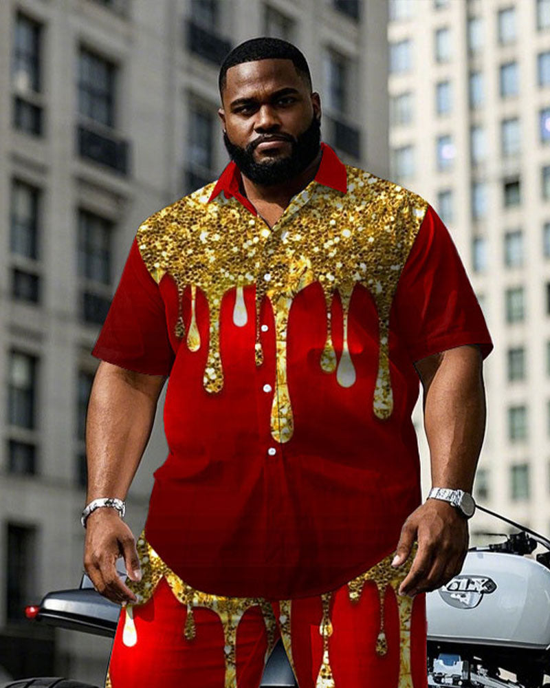 Big Men's Gold & Red Cotton-Blend Sequin Halloween Short Sleeve Shirt Trouser Set