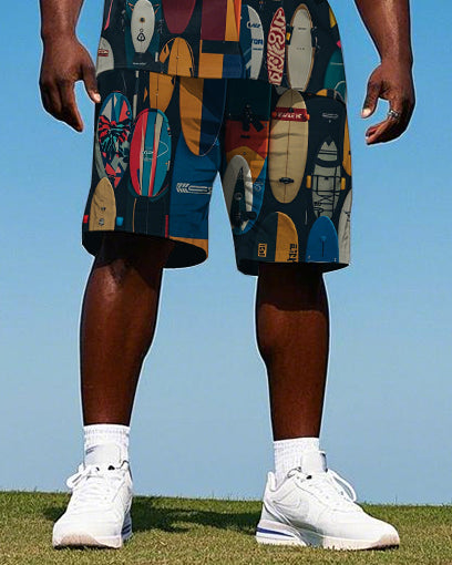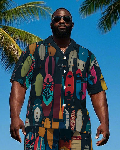 Big Men's Hawaiian Fashion Abstract Colorful Surfboard Printed Cuban Collar Short Sleeve Shirt Shorts Set