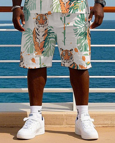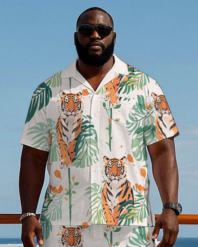 Big Men's Hawaiian Funny Tiger and Palm Leaf Printed Cuban Collar Short Sleeve Shirt Shorts Set